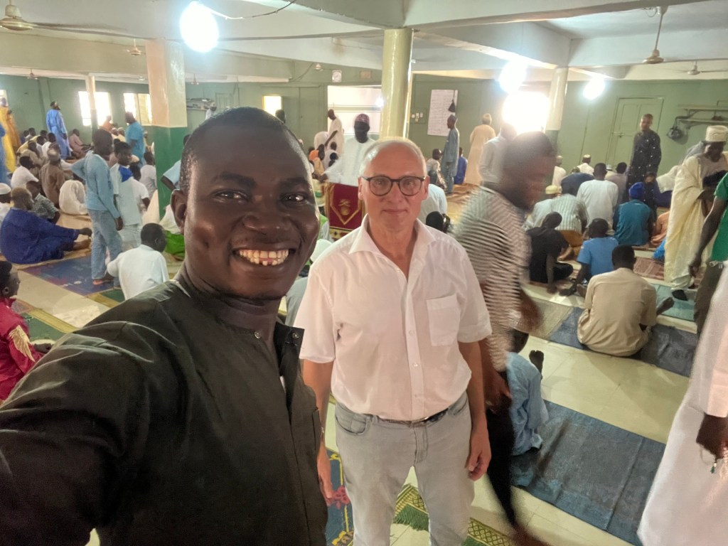 Schuhe aus. Die Moschee ist bis auf den letzten Platz gefüllt. Kinder laufen herum, ansonsten überwiegend junge Männer in tiefem Gebet, Richtung Osten. Ich bemühe mich weder aufzufallen noch zu stören. Der Imam betet auf arabisch vor, die Gläubigen nach. Geschafft. Es dauert nicht lange, dann gehen wir wieder, gehe niemals vor den Betenden. Ein Foto, Händeschütteln mit Offiziellen.